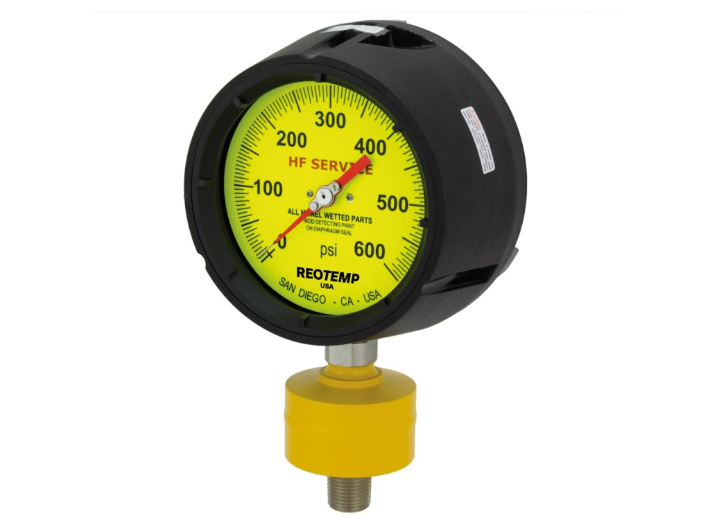 REOTEMP Model MSX HF Safety Gauge is a specially designed Mechanical Pressure Gauge for use in Hydrofluoric Acid service. Both the diaphragm seal components and pressure gauge internals are made with Monel A400 material, complying with EPA rules on dual containment. The entire diaphragm seal system is completely welded and coated with acid-detecting paint providing a visual alert in the event of a process leak around the diaphragm seal.