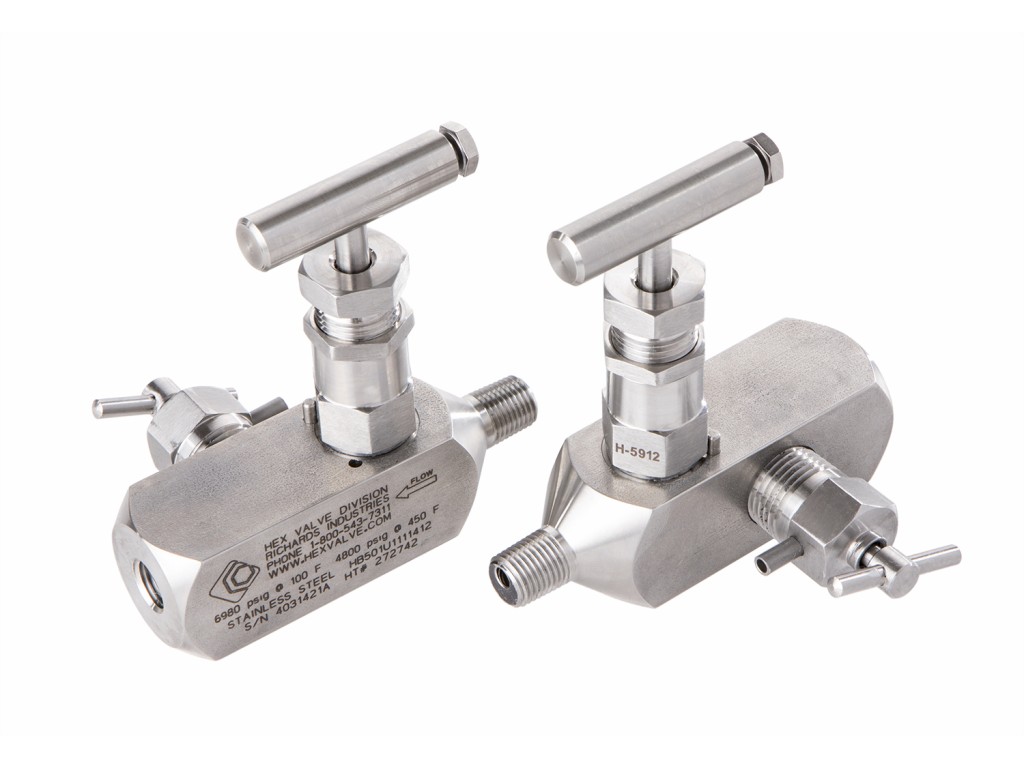 The HB50 features a fully packed and backseated block valve along with a bleed valve with directional discharge tube and stem stop. With a gauge or transmitter threaded into its outlet, the HB50 will allow pressure to be bled and blocked for simplified instrument removal. The discharge tube enables the technician to direct the high pressure fluid away from himself before changing the instrument. The HB50 can also be threaded into a Hex Primary Block Valve (such as the HG46 Series) to provide secondary block and bleed functions on multiple instrument installations.