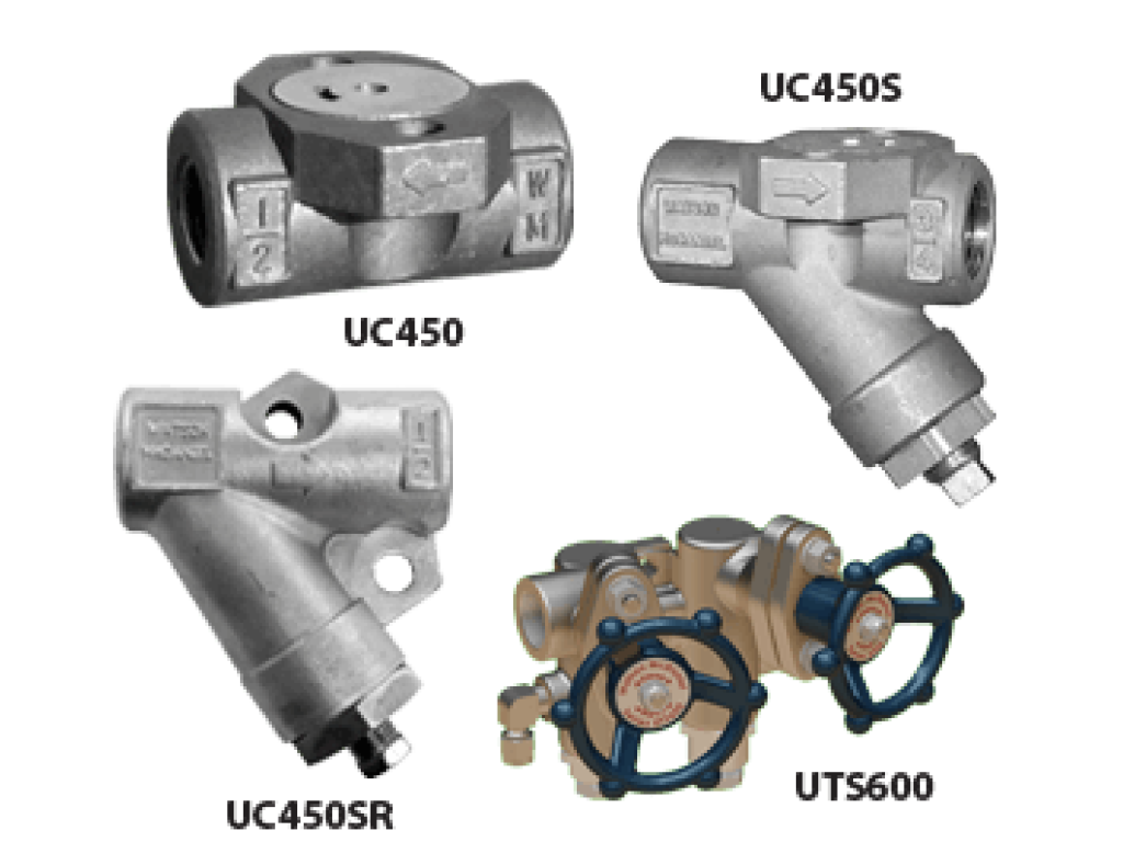 The UC450 Series QUICK-CHANGE Universal Trap-Connector System with multiple choices for trap modules and connectors are used in steam systems where a simplified and economical maintenance program of steam traps is desired. These Universal Style quick replacement steam traps can be used on steam supply lines as well as for tracing and small process applications. They are commonly used in colleges & universities, hospitals, chemical plants, petrochemical refineries, paper mills and other industrial facilities.